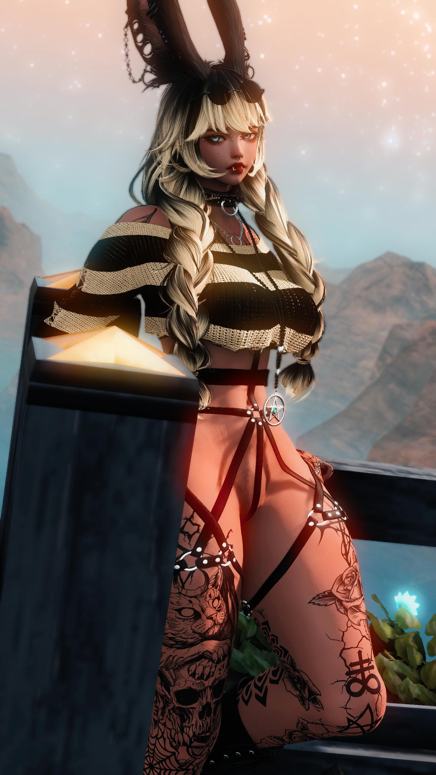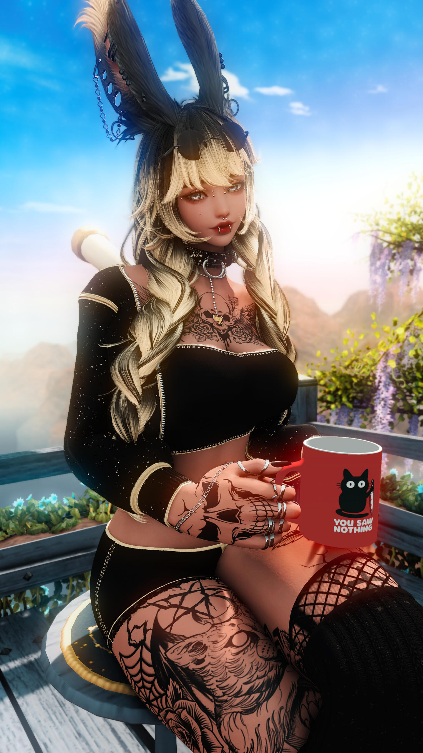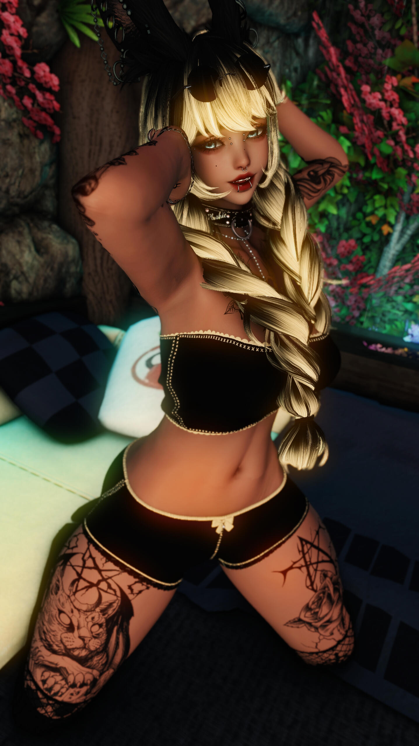 Race: Kami/Spirit (Visually is a Viera currently)- Wears a choker with her namesake written on it, "Plushie". Is also normally seen mostly black clothing with the same yellow highlights as her hair.- Can naturally shapeshift into whatever form they desire at that moment, including plushies both large and small on rare occasions.- When forced into combat, Malli prefers the quickness of her fists as a Monk, or the sharpened speedy steel of Viper blades. If not using either, She utilizes her vast reserves of Aether to support others as an Astrologian.